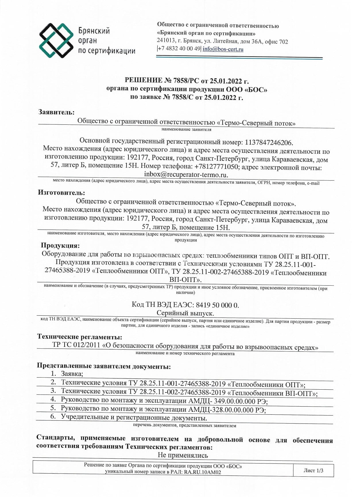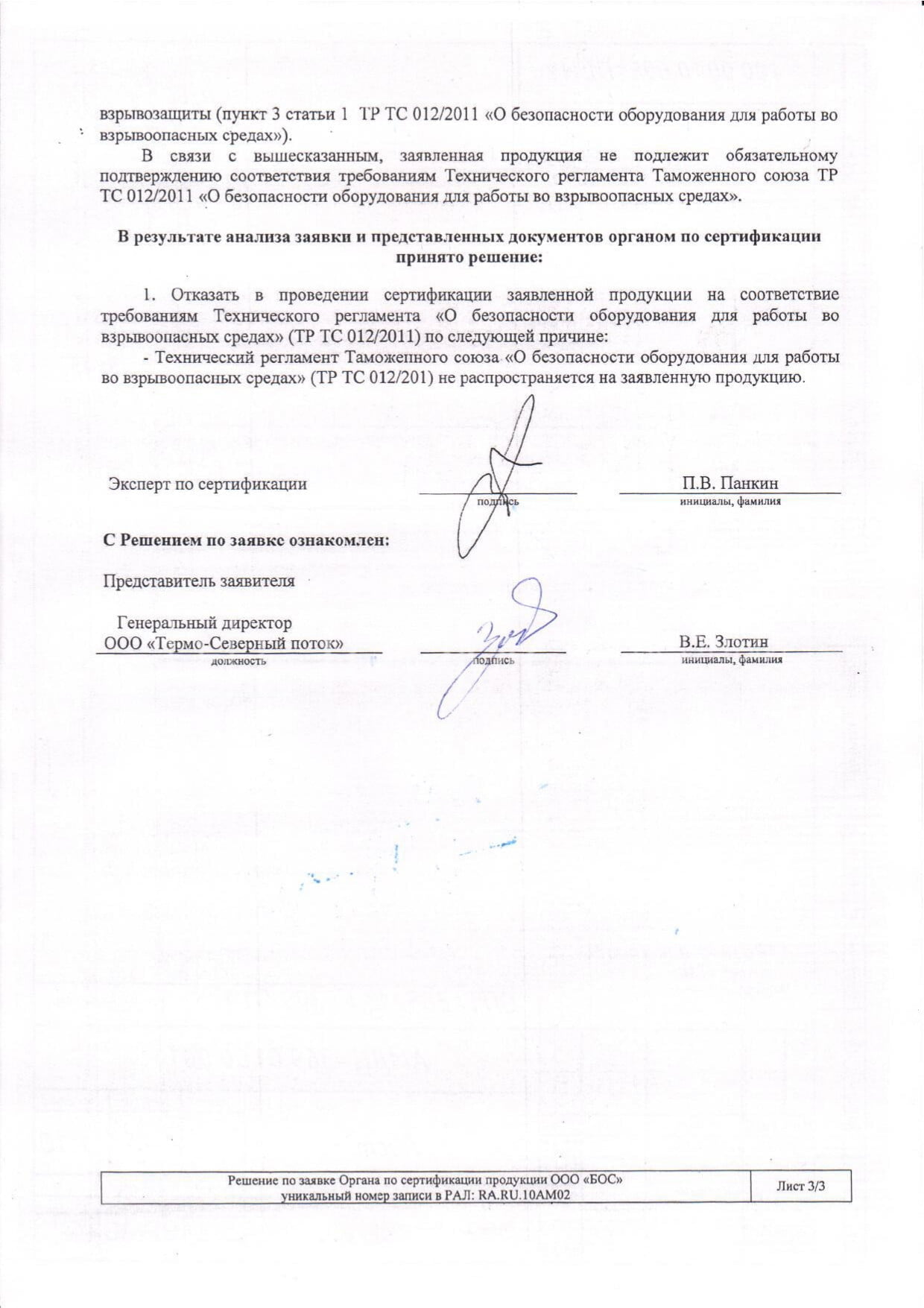 ООО «Термо-Северный поток» получило официальный документ свидетельствующий о том, что продукция, выпускаемая по ТУ 28.25.11-001-27465388-2019, ТУ 28.25.11-001-27465388-2019 не подлежит обязательному подтверждению соответствия требованиям технического регламента таможенного союза ТР ТС 012/2011 «О безопасности оборудования для работы во взрывоопасных средах». Решение №7858/РС от 25.01.2022.