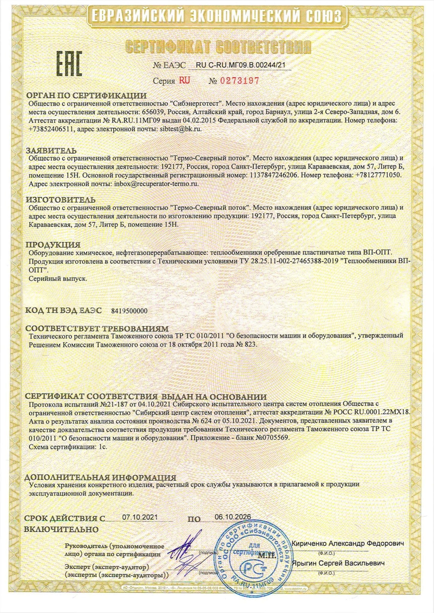 ООО «Термо-Северный поток» получил подтверждение о соответствии теплообменников ВП-ОПТ стандартам ТР ТС 010/2011